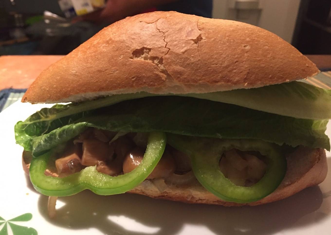 - Para terminar colocamos el pollo en el baguette y agregar chilenmorron y lechuga al gusto.